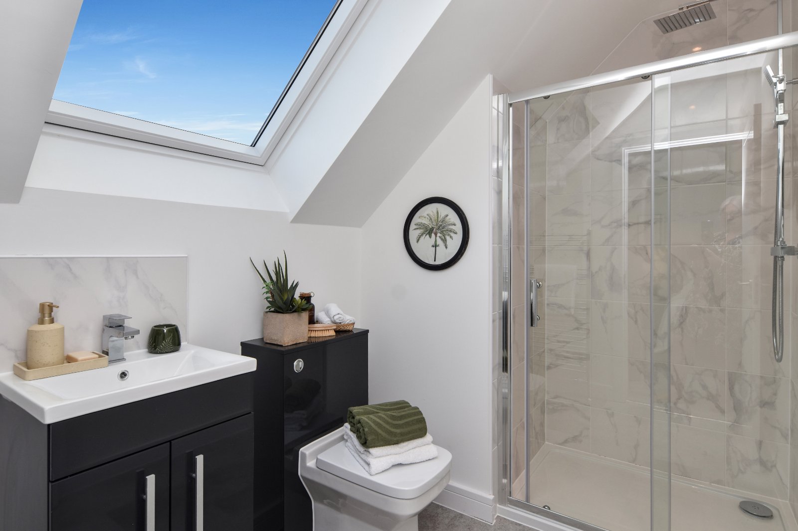 The suite comprises a large walk-in shower enclosed with clear glass sliding doors with integrated shower unit with hand held attachment and drencher style shower over and finished with luxurious marble-effect tiling. The stylish vanity unit with inset basin and chrome mixer tap offers both a bold visual statement and practical storage with a matching concealed cistern dual flush wc. A large uPVC double glazed Velux window providing natural light. Ladder style heated towel rail and smooth plastered part vaulted ceiling.