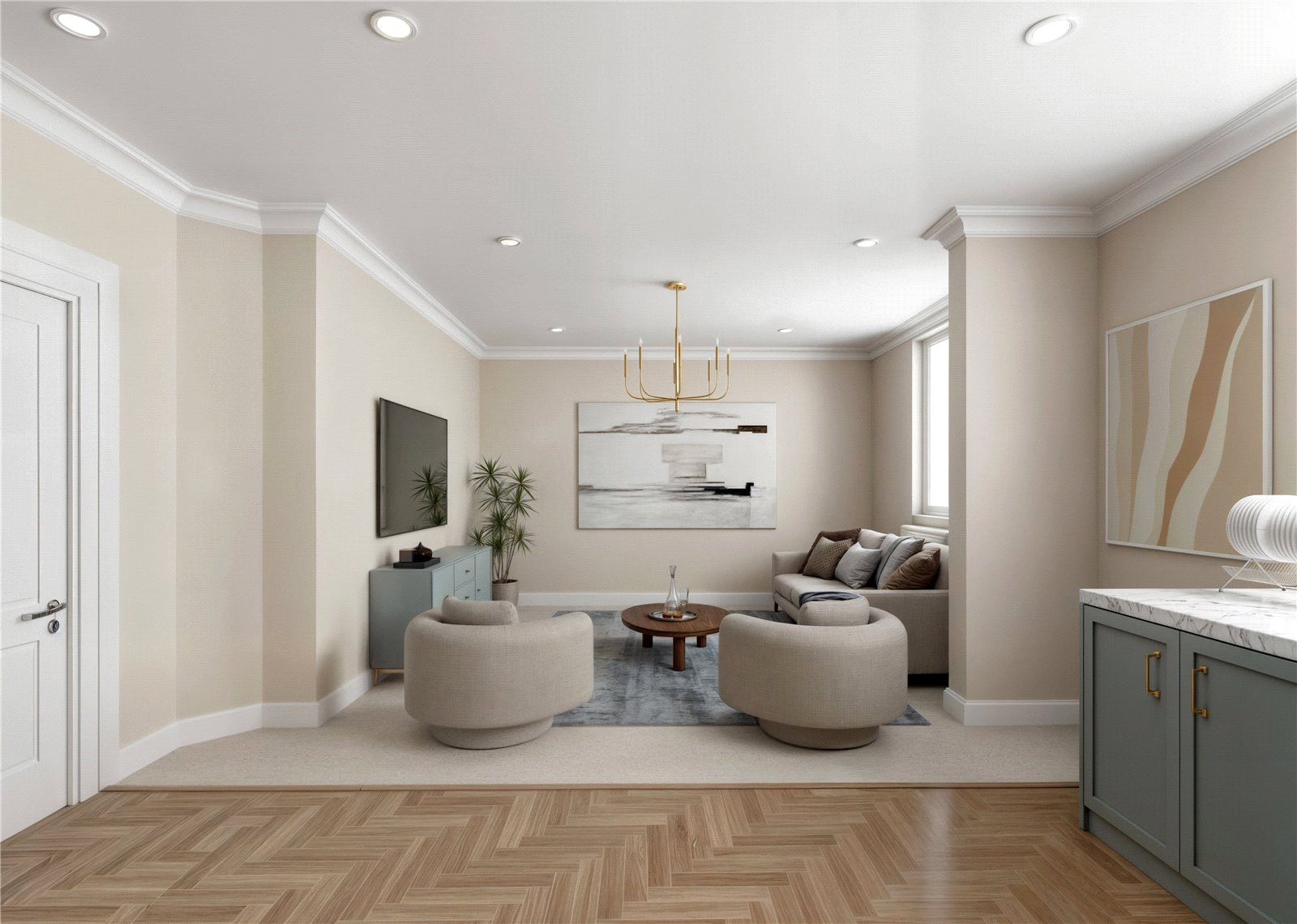 At the heart of the apartment is a generous open-plan Living/Kitchen, complete with contemporary shaker units, integrated appliances, marble-style surfaces and stylish herringbone flooring. The living zone offers a refined yet relaxed ambiance—ideal for both quiet evenings and entertaining.