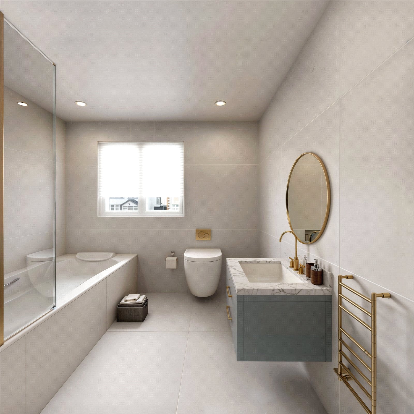 The sleek hotel inspired bathroom features a minimalist aesthetic with quality fixtures and fittings.