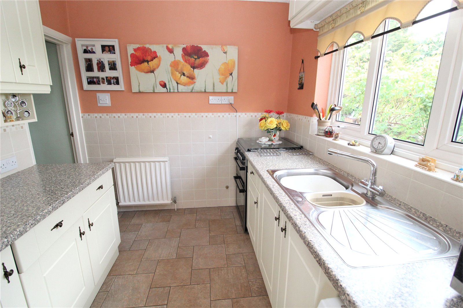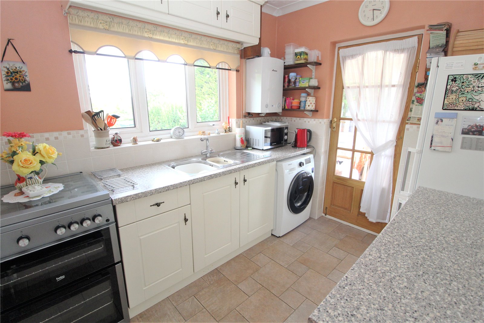 Fitted with bowl and half stainless steel sink unit with mixer taps. Roll edge work surfaces with cupboards and drawers under. Space and plumbing for washing machine. Recess for cooker. Return roll edge work surfaces with base cupboards and drawers under, matching eye level cabinets above. Space for upright fridge/freezer. Wall mounted boiler serving gas central heating. Ceramic tiled floor. Double radiator. Inset ceiling spotlights. Upvc double glazed window to rear. Three quarter glazed door to side giving access to