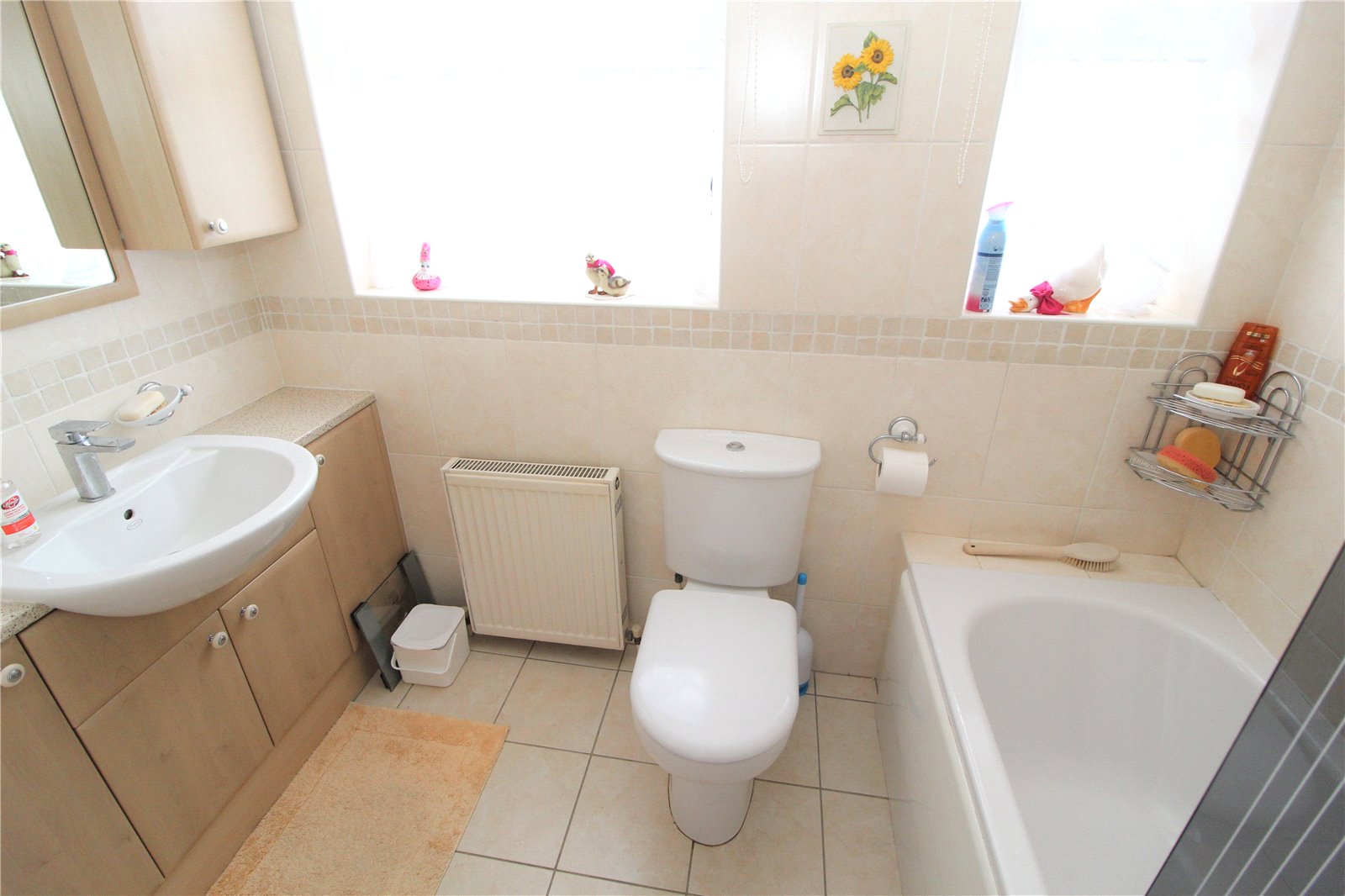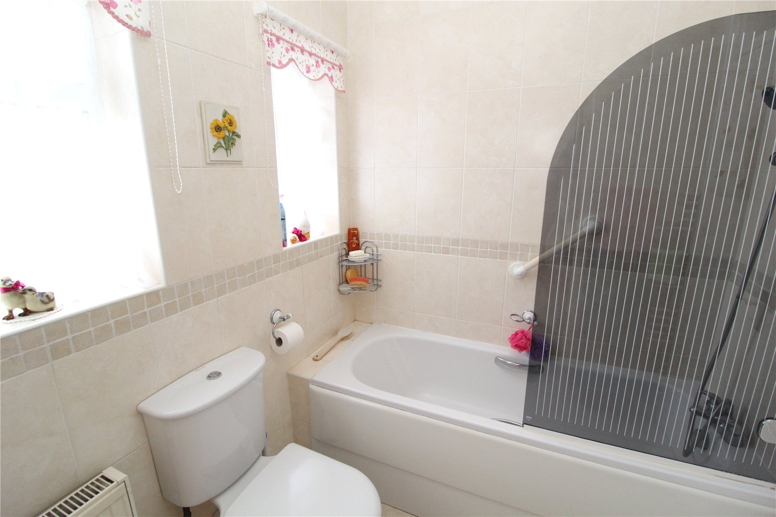 Fitted with a modern white suite comprising panelled bath with mixer taps and shower attachment with screen. Low flush w.c., Wash hand basin set within vanity unit with mirror and cupboards above. Fully tiled walls. Ceramic tiled floor. Heated towel rail. Upvc double glazed obscure windows to side. Smooth plastered ceiling with inset spotlights.