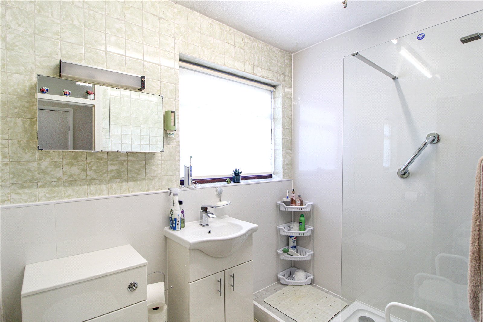 Tiled walls, double glazed obscure window to rear aspect, smooth ceiling, spotlights to ceiling, large shower, sink with vanity unit and WC, lino to floor