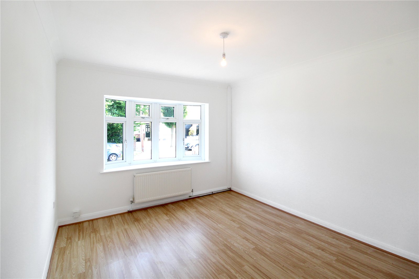 Upvc double glazed bay window to front. Smooth plastered walls and ceiling with coving. Wood effect laminate flooring. Radiator.