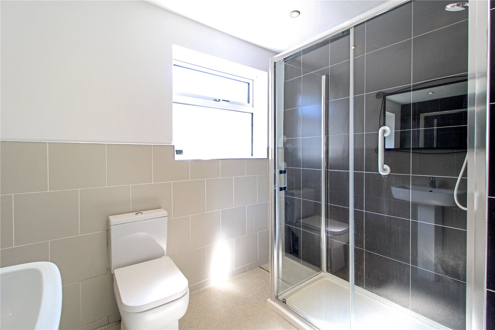 Fitted with a modern three piece white suite comprising double width shower cubicle with sliding doors. Low flush w.c, and pedestal wash hand basin. Fully tiled around shower area, the remainder is half tiled. Radiator. Smooth plastered walls and ceiling with inset spotlights. Double glazed obscure window to side.