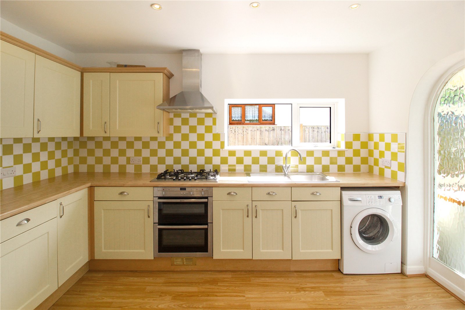 Fitted with single bowl, single drainer stainless steel sink unit with mixer taps set within roll edge work surfaces with cupboards and drawers under, matching eye level cabinets above. Built-in five ring 'Neff' gas hob with oven below and stainless steel extractor hood over. Space and plumbing for washing machine. Space for upright fridge/freezer. Tiling to working surface areas. Double glazed window to side. Radiator. Wood effect laminate flooring. Fifteen light glazed door with side lights adjacent giving access to