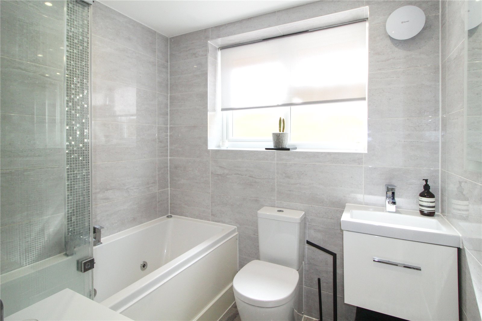 Opaque upvc double glazed window to the side aspect. Recently installed with a luxury white three piece suite comprising of low level w.c, wall mounted wash hand basin with cupboard under and stainless steel mixer tap and panelled enclosed jacuzzi bath with stainless steel mixer tap and wall mounted shower unit over with hair rinser and folding shower screen. Tiling to walls with feature mosaic tiles. Extractor fan. Smooth plastered ceiling with inset recess spot lighting. Ceramic tiled floor with underfloor heating. Heated towel rail.
