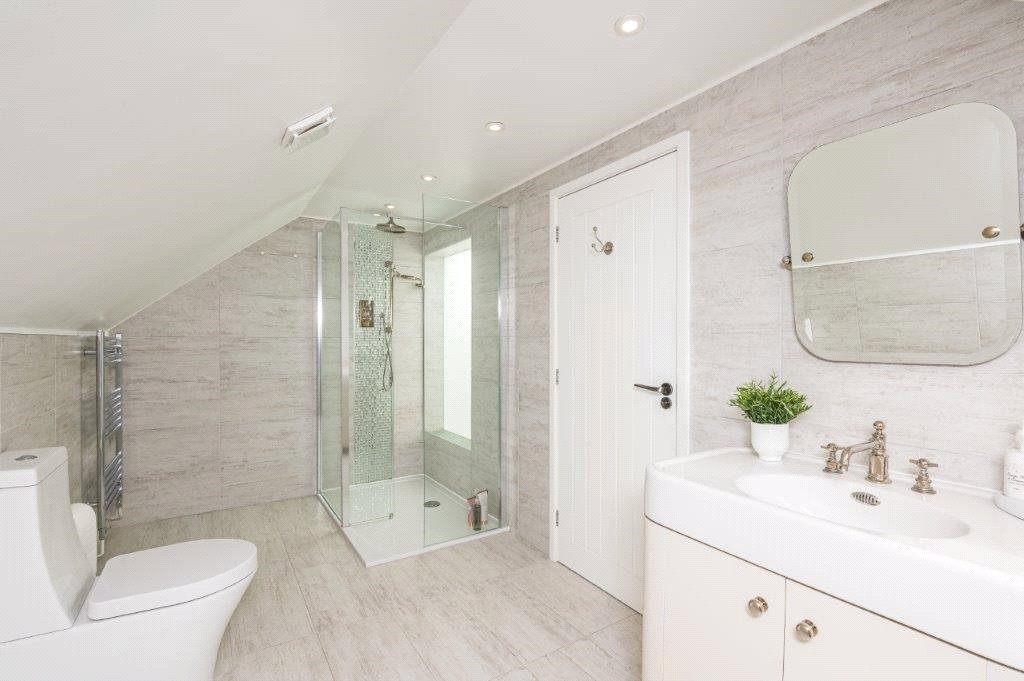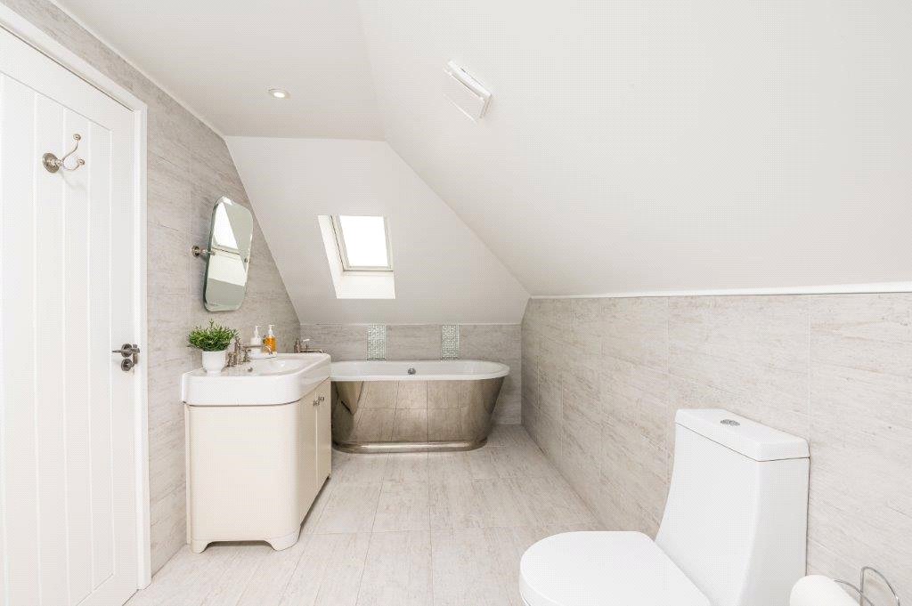 Double glazed skylight to side, freestanding oval bath with freestanding mixer taps and shower attachment, large vanity sink unit with mixer taps with mirror over, low flush WC, shower cubicle with rainfall shower over and further shower attachment and mixer taps, tiled floor, smooth plastered ceiling with downlighters and restricted headroom.