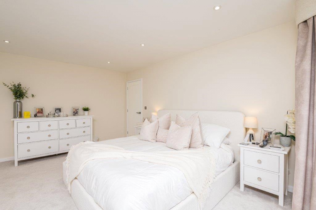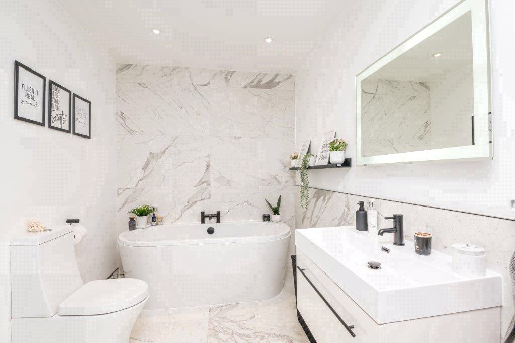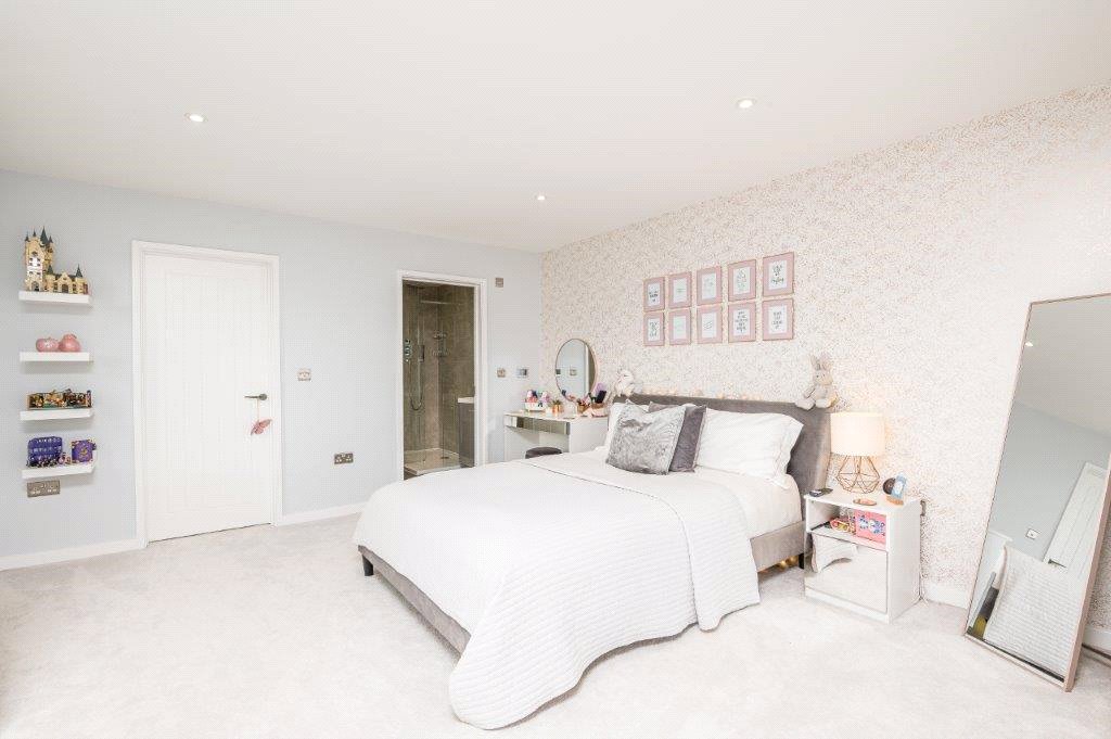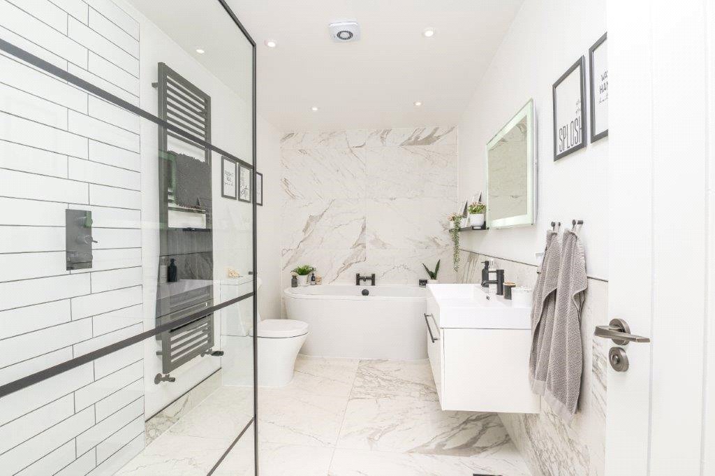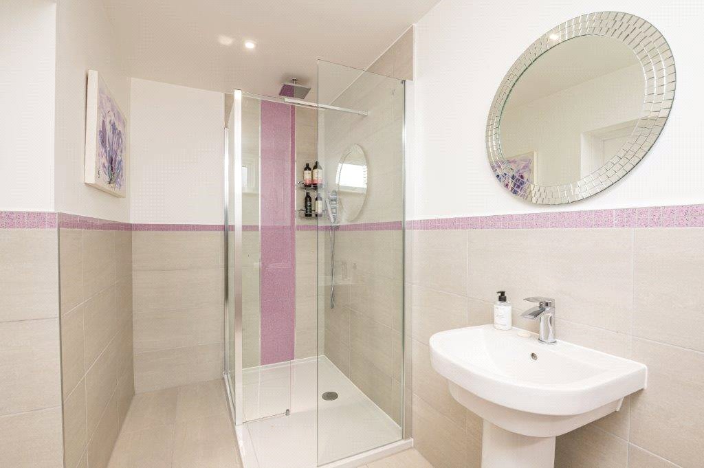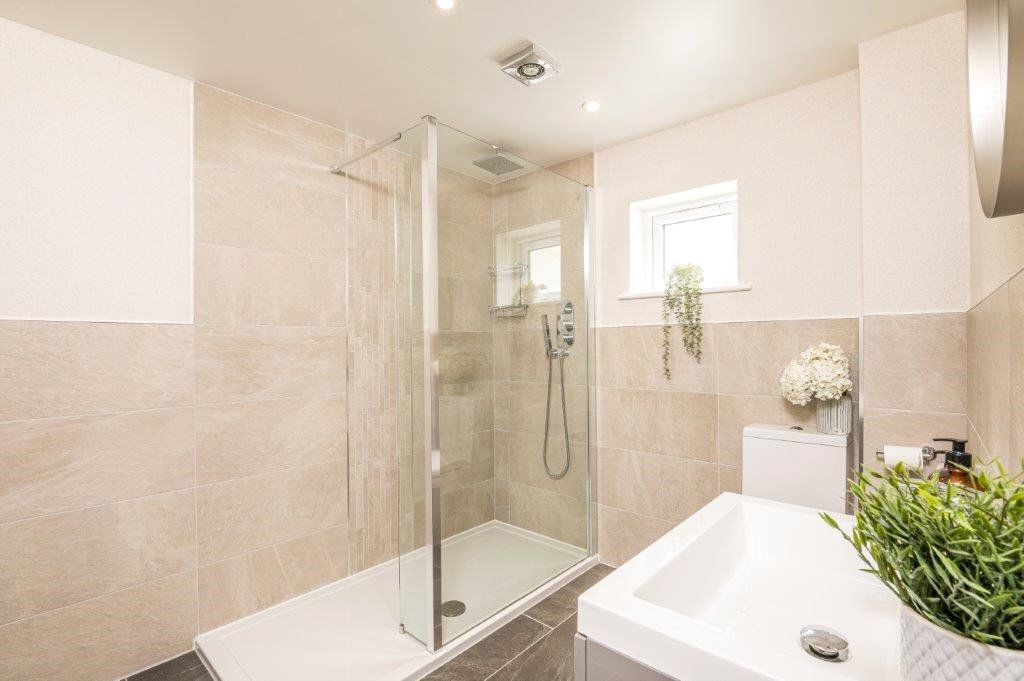 Double glazed skylight. Suite comprises of an Oval shaped freestanding bath with central mixer taps, low flush WC, vanity sink unit with mixer taps with wall mounted mirror with lighting, walk in shower with rainfall head and further shower attachment with mixer taps, tiled floor with underfloor heating, heated towel rail, smooth plastered ceiling with down lighters and extractor fan.