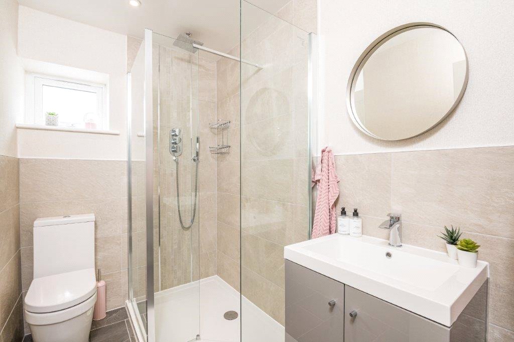 Obscure double glazed window to side, shower cubicle with rainfall shower over and further shower attachment with mixer taps, vanity sink unit with mixer taps, low flush WC, heated towel rail, smooth plastered ceiling with downlighters and extractor fan.