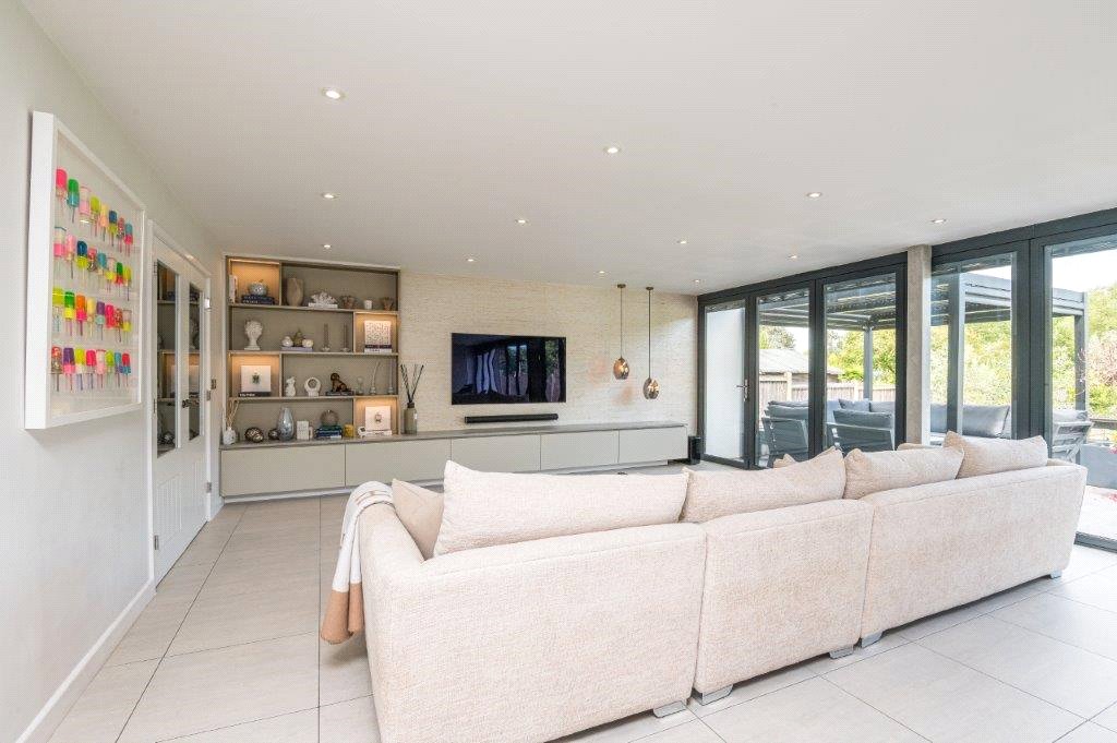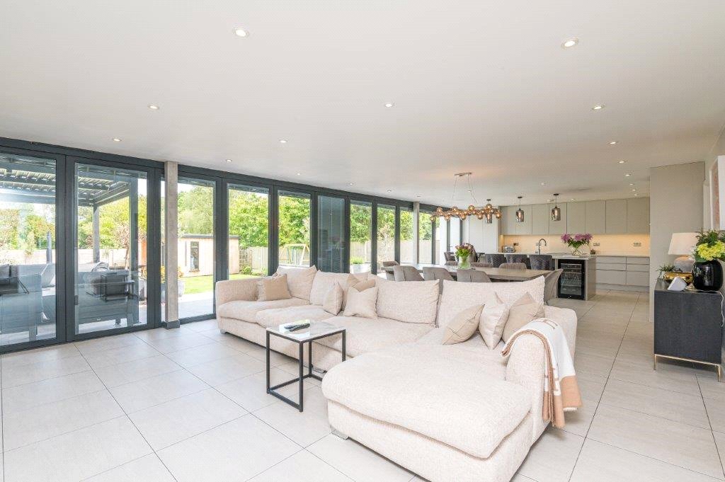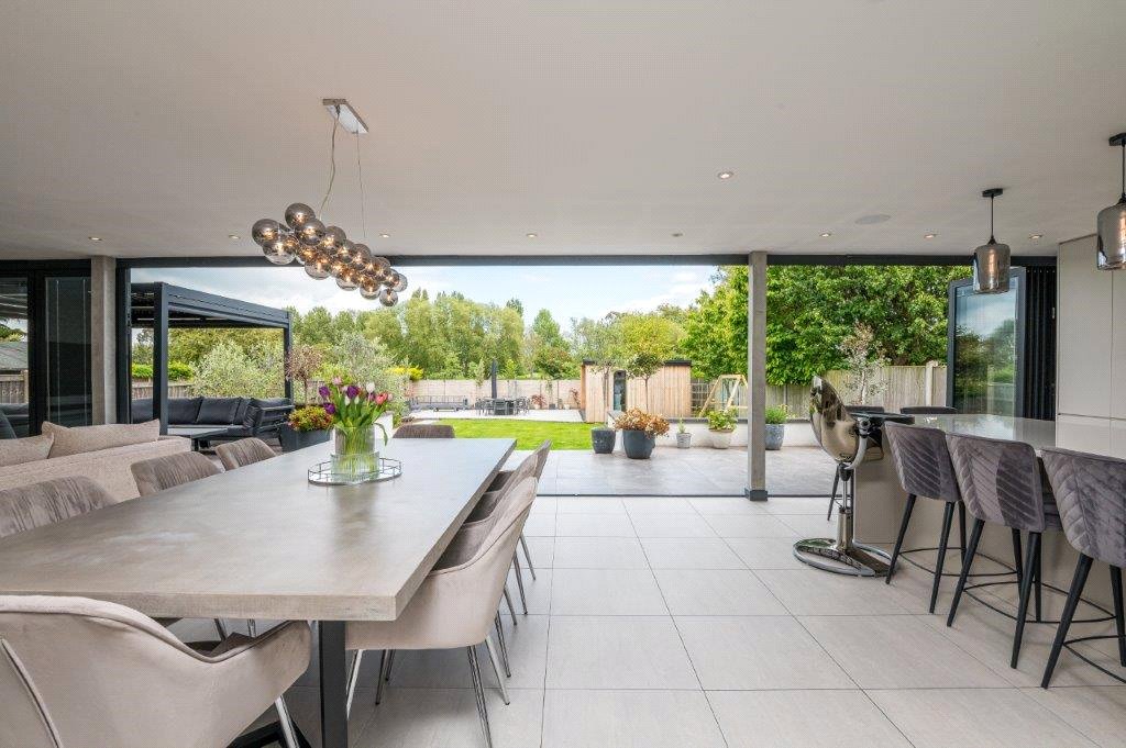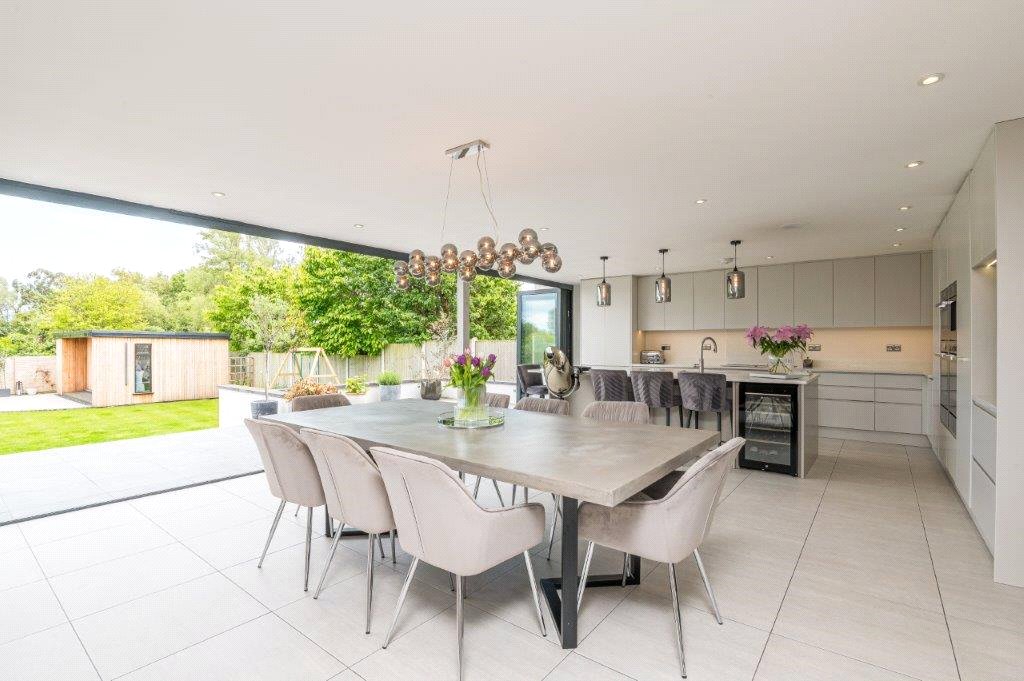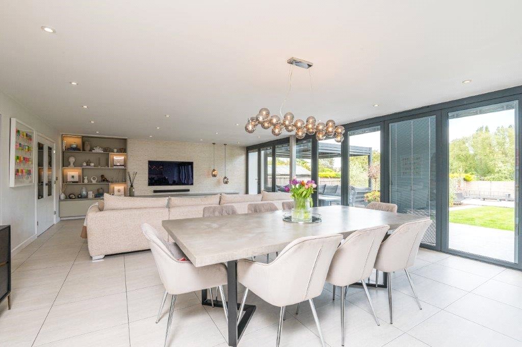 Spacious family room offering so much from the lounge area for relaxing to the dining area and luxury fitted kitchen with the added benefit of bi-folding doors opening to the landscaped garden. The bespoke fitted kitchen offers a range of base and eye level units with concealed lighting, built in 4 ring induction electric hob with down draft extractor hood all inset to the granite worktop with matching upstands, integrated full length fridge and a separate freezer, 2 NEFF ovens and a NEFF combi oven, all self cleaning and with warming drawers below, NEFF built in coffee machine, pull out pantry cupboard. Bespoke recess area which the vendor uses for cocktail making and drawers housing glasses. The central island offers seating for 6 people, stainless steel sink unit with Quooker hot tap inset to the granite worktop with drainer, integrated NEFF dishwasher, further recess for an extra fridge, smooth plastered ceiling with downlighters, porcelain flooring with underfloor heating.