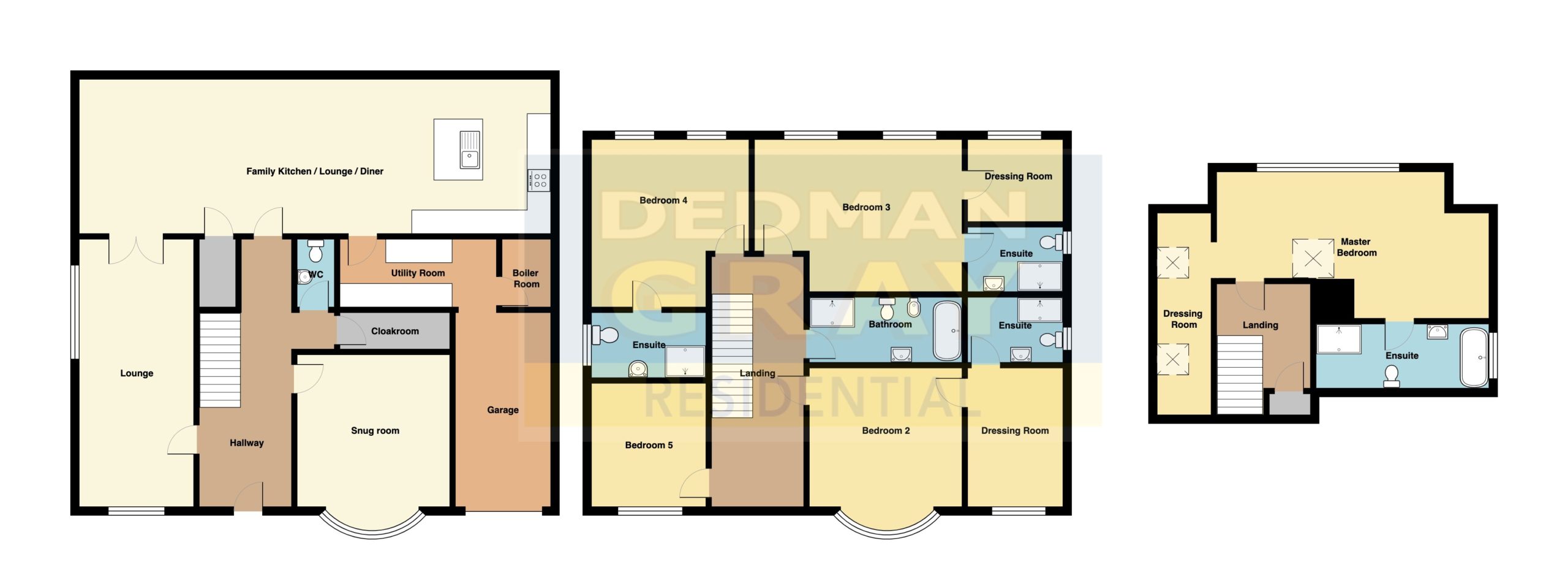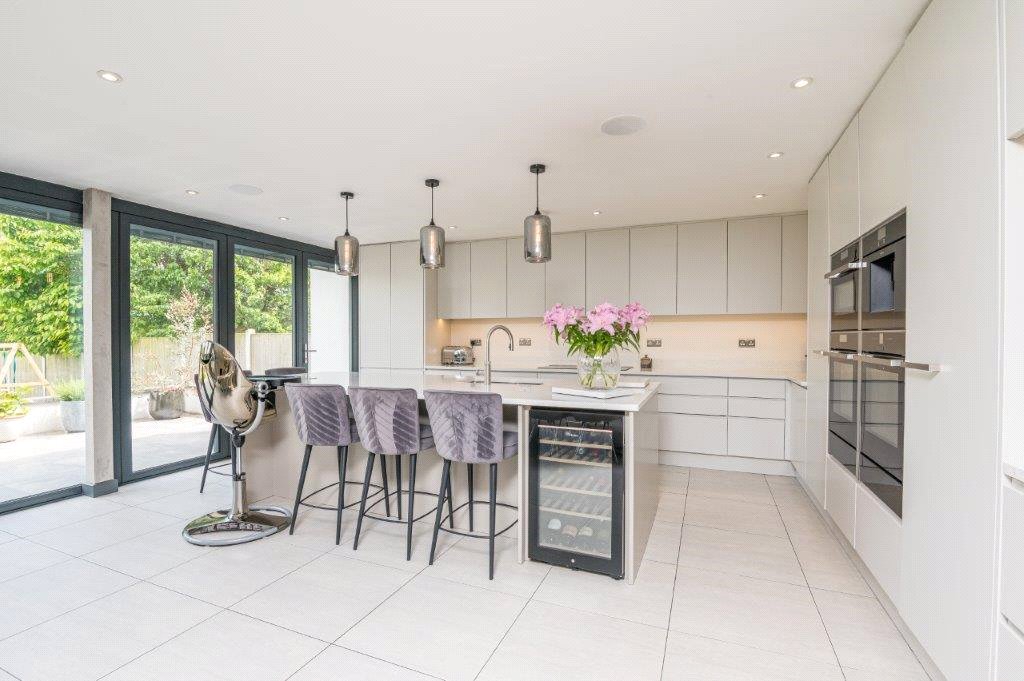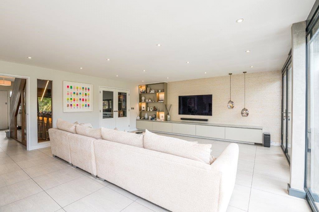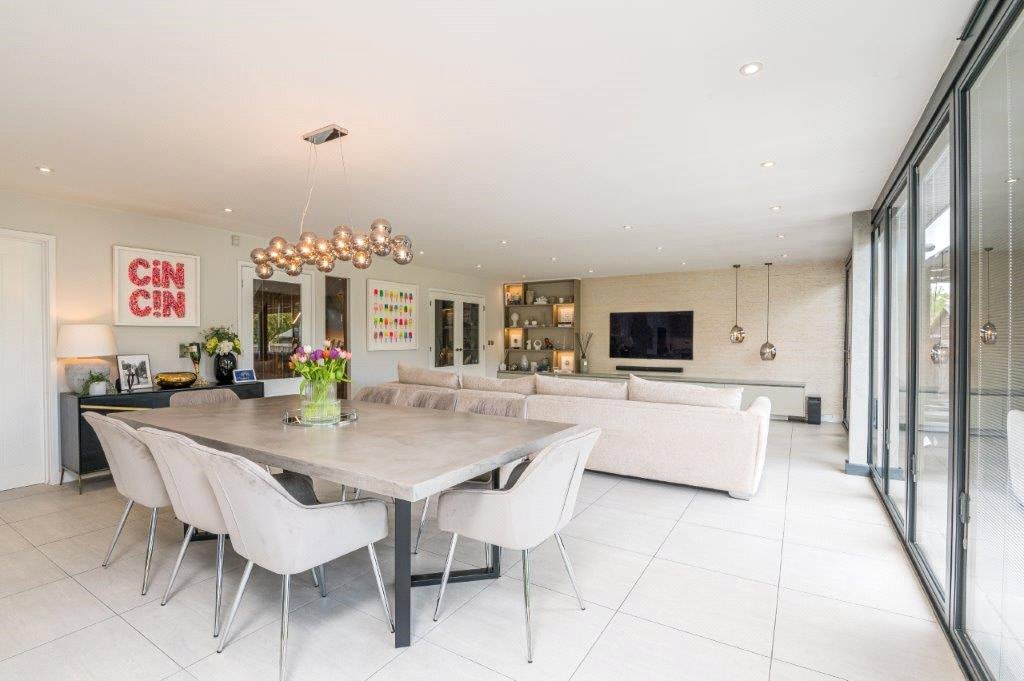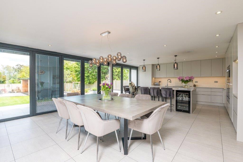 Spacious family room offering so much from the lounge area for relaxing to the dining area and luxury fitted kitchen with the added benefit of bi-folding doors opening to the landscaped garden. The bespoke fitted kitchen offers a range of base and eye level units with concealed lighting, built in 4 ring induction electric hob with down draft extractor hood all inset to the granite worktop with matching upstands, integrated full length fridge and a separate freezer, 2 NEFF ovens and a NEFF combi oven, all self cleaning and with warming drawers below, NEFF built in coffee machine, pull out pantry cupboard. Bespoke recess area which the vendor uses for cocktail making and drawers housing glasses. The central island offers seating for 6 people, stainless steel sink unit with Quooker hot tap inset to the granite worktop with drainer, integrated NEFF dishwasher, further recess for an extra fridge, smooth plastered ceiling with downlighters, porcelain flooring with underfloor heating.