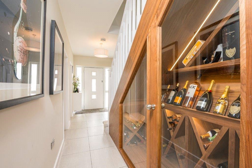 (in length) Porcelain tiled floor with underfloor heating, stairs leading to the first floor with bespoke understairs bar area, smooth plastered ceiling and doors to