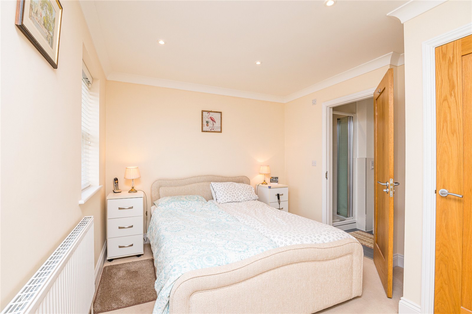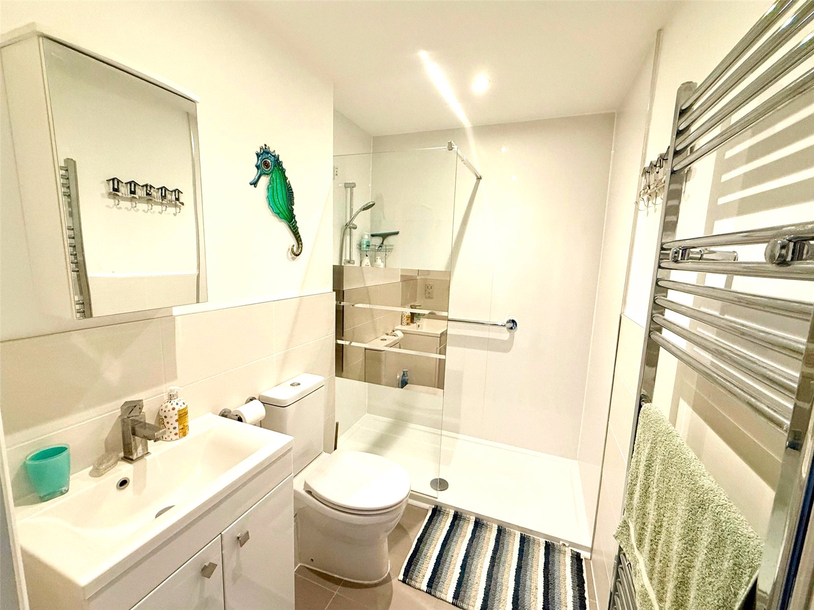 Fitted with a three piece suite comprising independent fully tiled shower cubicle with integrated shower, gloss fronted vanity wash hand basin with mixer tap and dual flush close coupled w.c. Ceramic tiling to half height with aluminium bordered edging and full tiling to the shower area. Ceramic tiled floor. Full height chrome heated towel rail. Smooth plastered ceiling. Recessed LED lighting. Extractor fan.